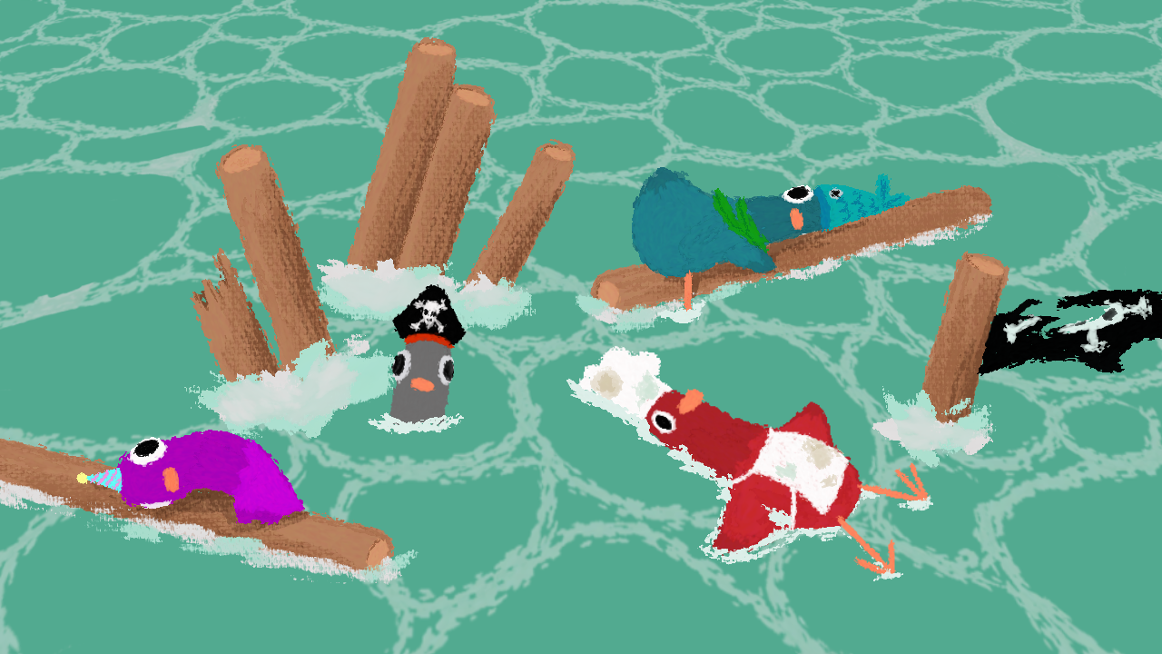 Pirate Pigeons is a 2 to 4 players chaotic co-op party game where you try to get your ship going as long as possible without sinking : fix leaks, yeet clandestine passengers away, maintain the motor. All of that controlling quirky pigeons dressed up as pirates.